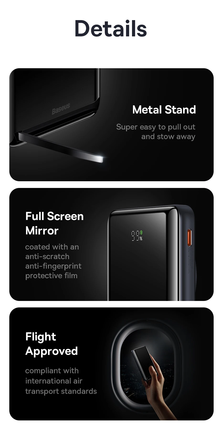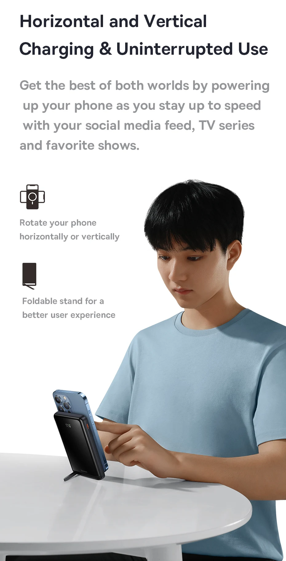 Carregue seu iPhone enquanto utiliza: O Power Bank Baseus vem equipado com um suporte de metal que facilita o uso do seu celular enquanto carrega:
