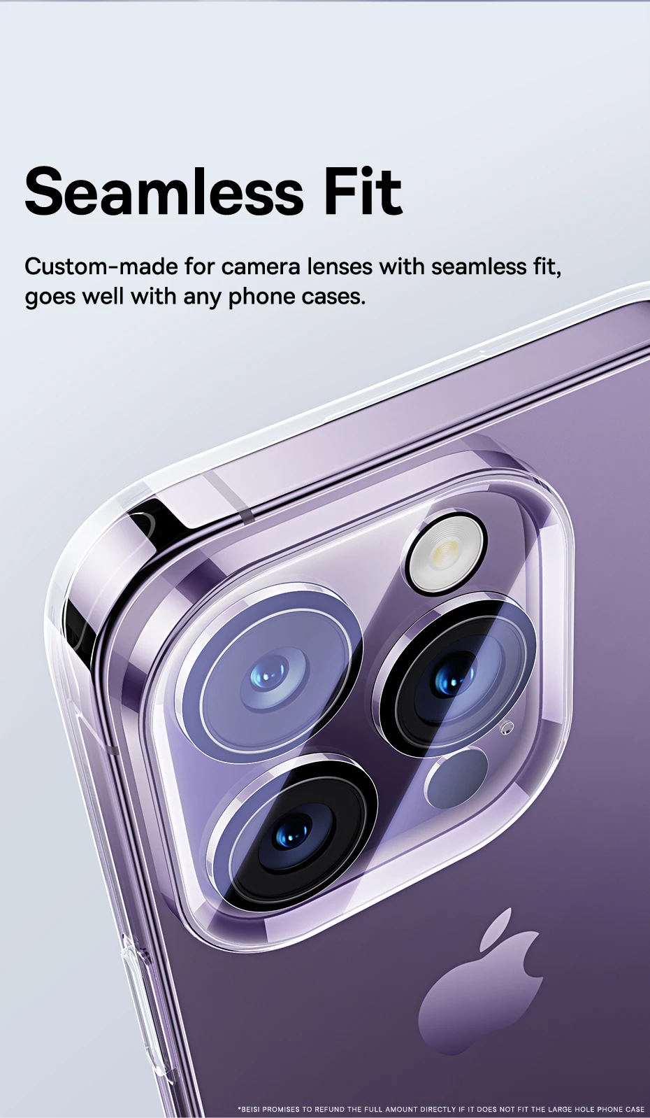 Vidro Corning: Além do Vidro Corning ter a exclusividade Baseus, ele também proporciona um ajuste melhor para a proteção de lente do iPhone 15: