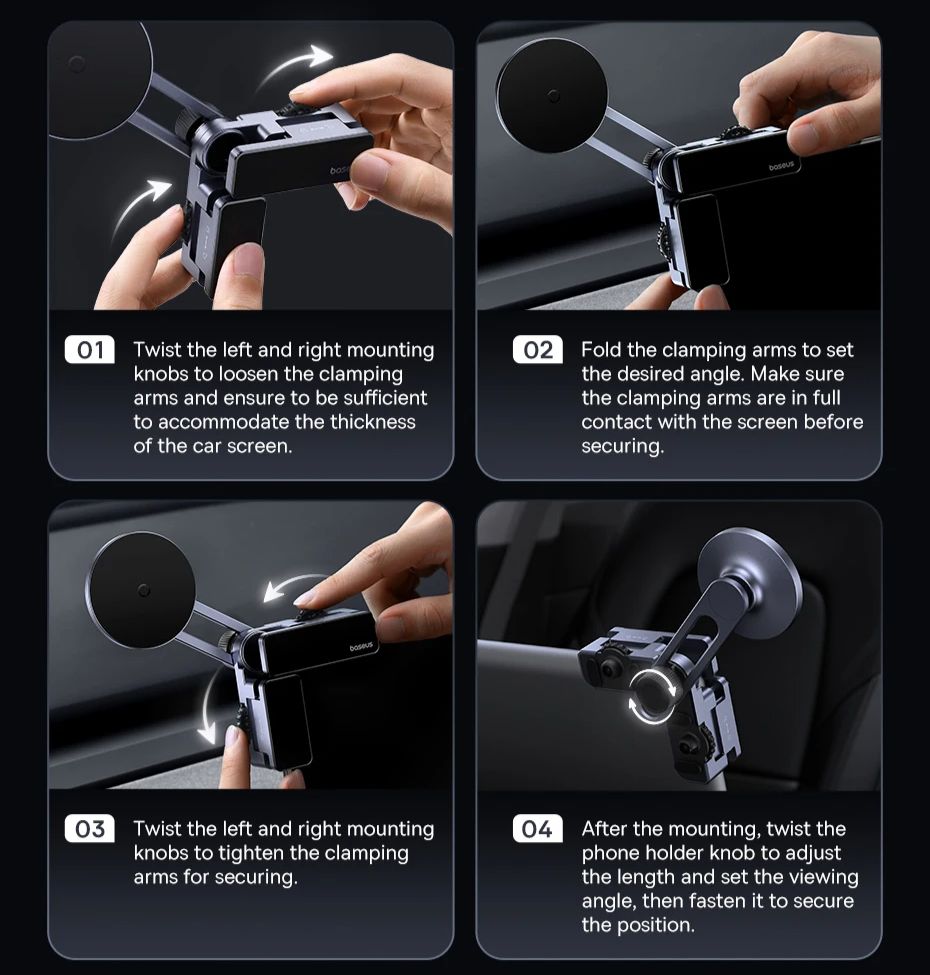 Instruções de Instalação: Fácil de fixar na tela do carro: afrouxe, ajuste e prenda os braços, configure o ângulo ideal e fixe para uso seguro, protegendo a tela: