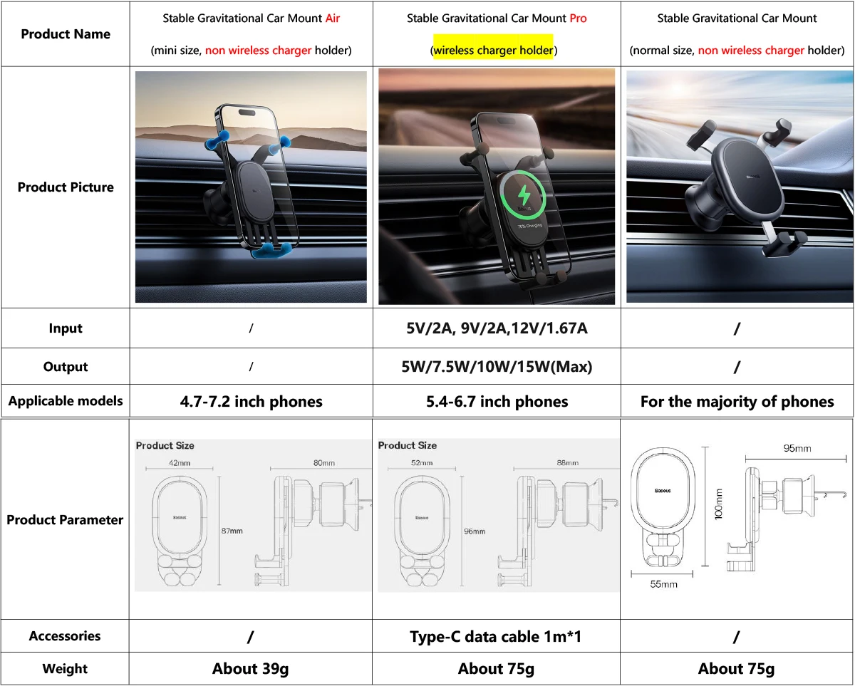 Ar gravitacional estável da montagem do carro (mini tamanho, suporte não sem fio do carregador)